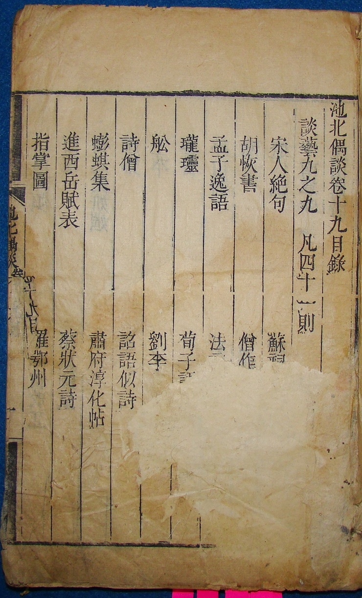 <³»¿ë> Áß±¹ ô質¶óÀÇ ½ÃÀÎ ¿Õ»çÁ¤(èÝÞÍïî, 1634~ 1711)ÀÇ ¼öÇÊÁý [ÁöºÏ¿ì´ã(ò®ÝÁéÏÓÈ)] ÙÊ÷ùÜâ Ïé19~22 ÇÑ Ã¥À¸·Î ±ÇµÎ ±Ç¸» ¸î ÀåÀº ºÎºÐ ¼Õ»óÀÌ ÀÖ´Ù. <Å©±â> 16¡¿25cm <Âü°í> ¿Õ»çÁ¤(èÝÞÍïî), 1634³â ~ 1711³â û³ª¶ó »êµ¿(ߣÔÔ) Á¦³²ºÎ(ðÑõݤ) ½Å¼º(ãæàò) »ç¶÷. ÀÚ´Â ÀÌ»ó(ìÂß¾) ¶Ç´Â ÀÚÁø(íòØ)À̰í, È£´Â ¿ÏÁ¤(èÖïÍ)À̸ç, ¸¸È£(عûÜ)´Â ¾î¾ç»êÀÎ(åÛåÇߣìÑ)À̰í, ½ÃÈ£´Â ¹®°£(ÙþÊÛ)À¸·Î, º»¸íÀº »çÁø(ÞÍ禛)ÀÌ´Ù. À̸§ÀÌ ¿ËÁ¤Á¦ÀÇ À̸§°ú °°¾Æ »çÁ¤(ÞÍïá)À̶ó °íÃÆ´Âµ¥, °Ç¸¢Á¦°¡ »çÁ¤(ÞÍïî)À̶ó´Â À̸§À» ÇÏ»çÇß´Ù. ¼øÄ¡(â÷ö½) 15³â(1658) Áø»ç(òäÞÍ)°¡ µÇ¾î ¾çÁÖºÎÃß°ü(åÀñ¶Ý¤õÏί)¿¡ ÀÓ¸íµÇ¾ú´Ù. °Èñ(ˬý÷) ¿¬°£¿¡ ¿¹ºÎÁÖ»ç(çßÝ»ñ«ÞÀ)¿Í ÇѸ²¿ø½Ã°(ù××ùêÂã´Ë»)À» ¿ªÀÓÇß°í, °üÁ÷Àº ÇüºÎ»ó¼(úýÝ»ßÆßö)±îÁö ¿Ã¶ú´Ù. ÆóÅÂÀÚ(øÈ÷¼í)¿Í âÈ(óÝûú)Çߴµ¥, 43³â(1704) ÀÌ ÀÏ·Î ÇõÁ÷(úÔòÅ)µÇ¾ú´Ù. ½Ã¿¡ ÀÖ¾î¼ ÀÏ´ëÁ¤Á¾(ìéÓÛïÒðó)À̶õ μÛÀ» µé¾ú´Ù. û³ª¶ó ½ÃdzÀ» È®¸³ÇÑ »ç¶÷ÀÌÀÚ ´ëÇ¥ÀûÀÎ ½ÃÀÎÀ¸·Î, ½Å¿î¼³(ãêê¤àã)À» ÁÖâÇÏ¿© 50¿© ³â µ¿¾È ½Ã´ÜÀ» À̲ø¾ú´Ù. ¹®Àå ¶ÇÇÑ ÀÚ¸ø ¿ì¾ÆÇϰí Àß °®Ãß¾îÁ® ÀÖ´Ù. Àú¼¿¡ ¡º´ë°æ´çÁý(ÓáÌèÓÑó¢)¡» 92±ÇÀÌ ÀÖ°í, ¸íÀÛÀ» Á¤¼±ÇÑ ¡º¾î¾ç»êÀÎÁ¤È·Ï(åÛåÇߣìÑïñü¤Öâ)¡» 12±ÇÀÌ ÀÖ´Ù. ¼öÇÊ¿¡ ¡ºÁöºÏ¿ì´ã(ò®ÝÁéÏÓÈ)¡» 26±Ç°ú ¡º°ÅÀÌ·Ï(ËÜæ¶Öâ)¡» 34±Ç, ¡ºÇâÁ¶Çʱâ(úÅðÓù¶ÑÀ)¡» 12±Ç µîÀÌ ÀÖ´Ù.